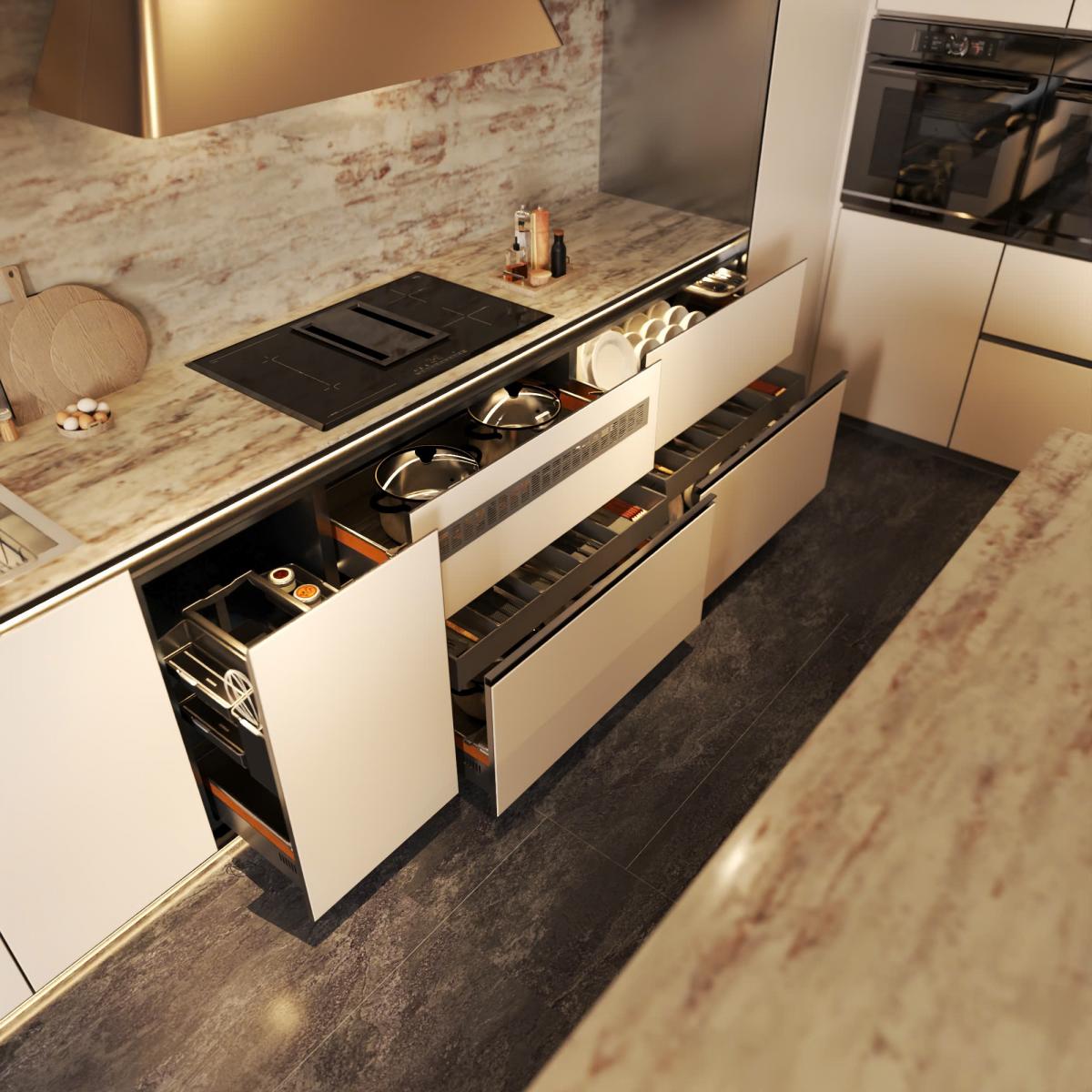 Phòng bếp là sự kết hợp giữa công năng tối ưu và vẻ đẹp thanh lịch. Hệ tủ bếp được bố trí khoa học đảm bảo quy trình sử dụng thuận tiện tích hợp phụ kiện thông minh nâng cao trải nghiệm nấu nướng. Vật liệu cánh thép cao cấp hoặc cánh kính nhám, cánh khính bóng hiện đại cùng ánh sáng được tính toán kỹ lưỡng tạo nên không gian bếp sang trọng bền vững theo thời gian.