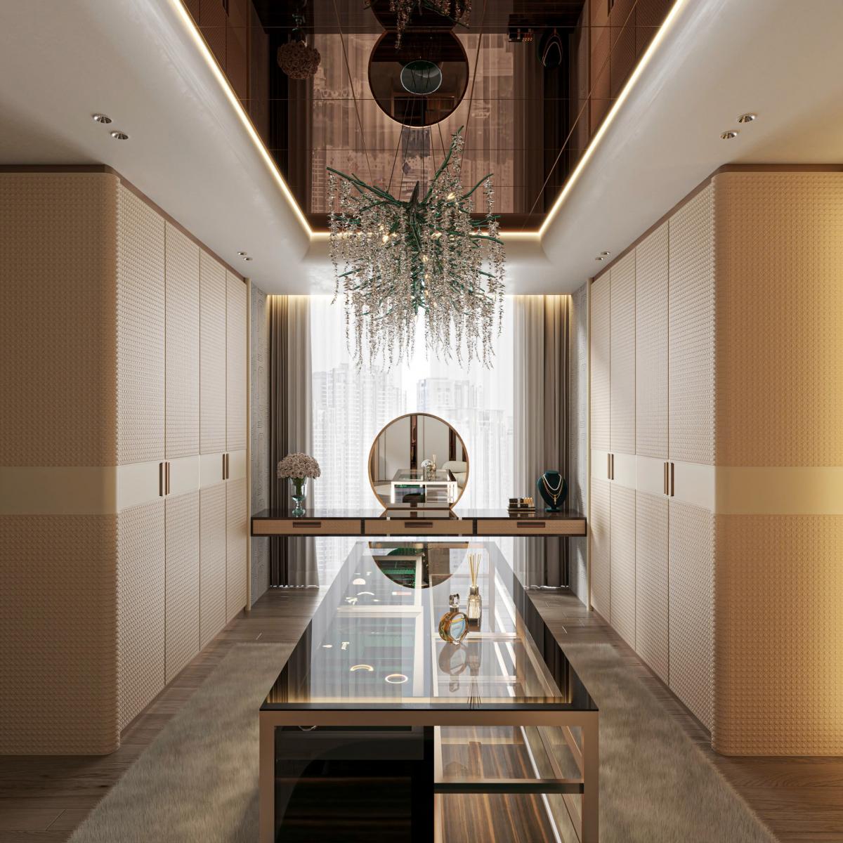 Dressing room được thiết kế như một không gian cá nhân hóa cao cấp với hệ tủ quần áo cánh kính phụ kiện trưng bày và các chi tiết da thủ công tinh xảo tạo nên cảm giác như một boutique tại gia thể hiện gu thẩm mỹ và vị thế của chủ nhân.